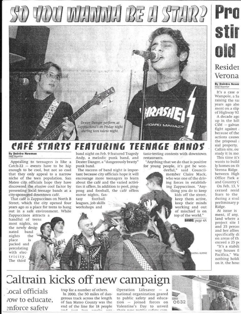 February 2001: Back when we were itty bitty punks – check out this front page story about our scene featuring Dexter Danger in the San Mateo Daily Journal.